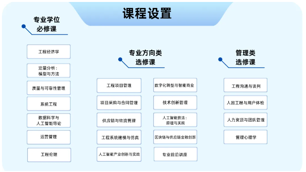 1、学科交叉融合:依托管理学院"工商管理"和"管理科学与工程"两大一级学科优势,整合学校优质工程学科资源,构建"管理+工程"复合型培养体系。重点打造信息管理、项目管理和系统管理三大方向,课程涵盖质量管理、供应链优化、风险管理、大数据应用等前沿领域。学生可根据职业发展需求,跨学科选修相关课程及专题讲座,培养解决复杂工程管理问题的多维能力。